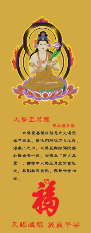 马年生人若能虔诚佩带供奉大势至菩萨之守护神像,使一生聚财守财,顺利平安。